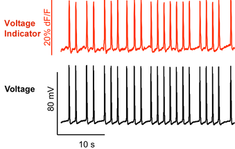 Voltage indicator (red) closely follows membrane voltage (black) measured with a patch clamp.